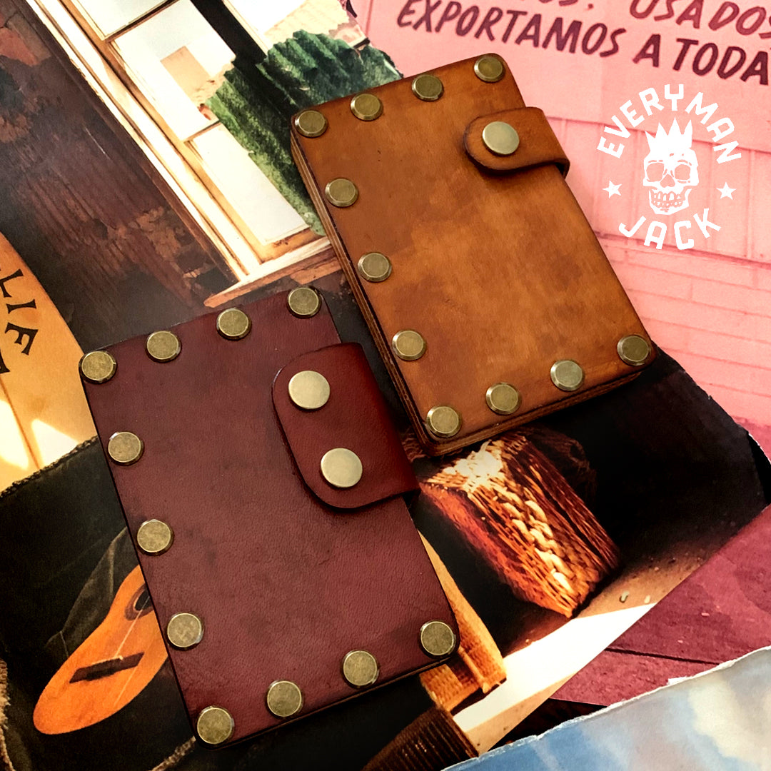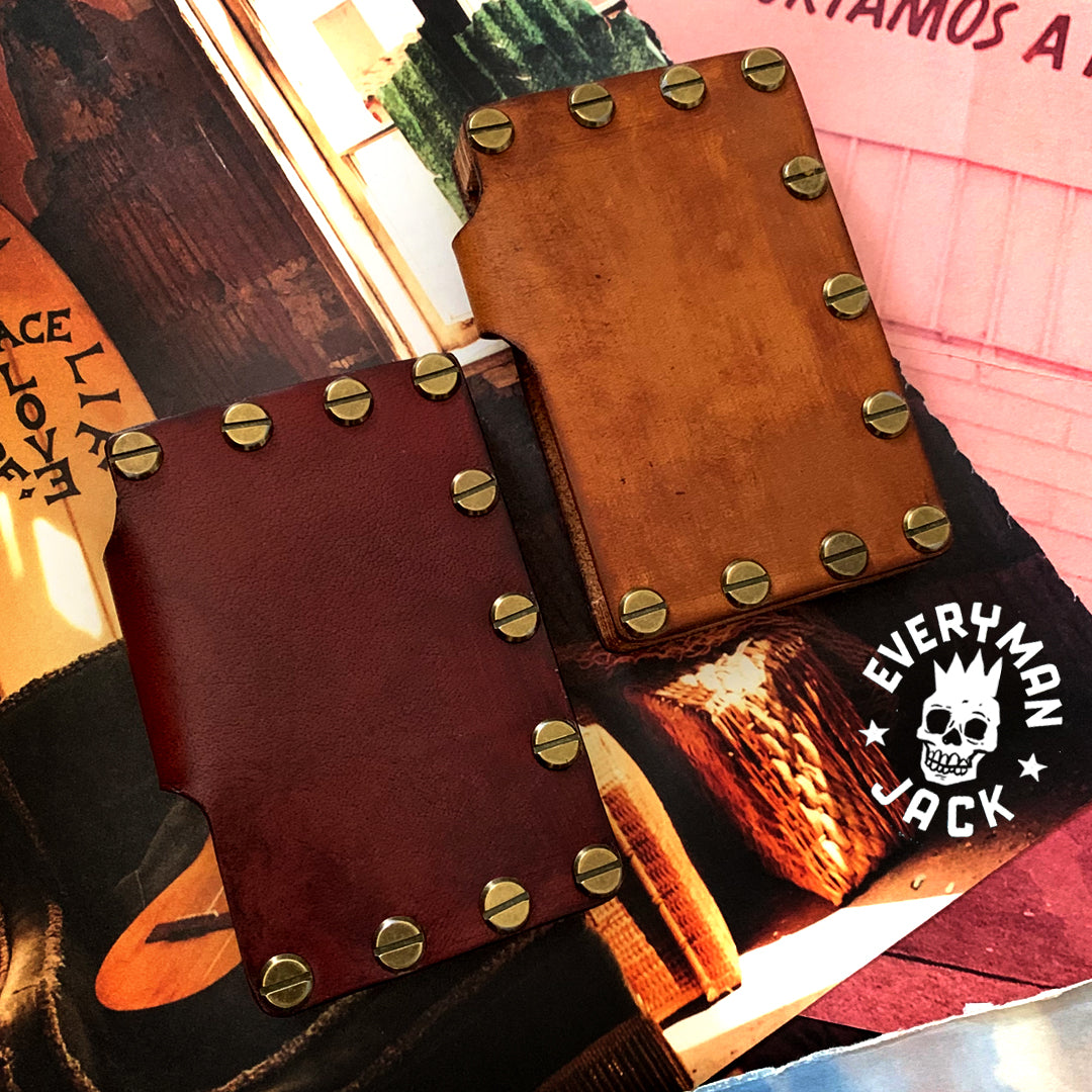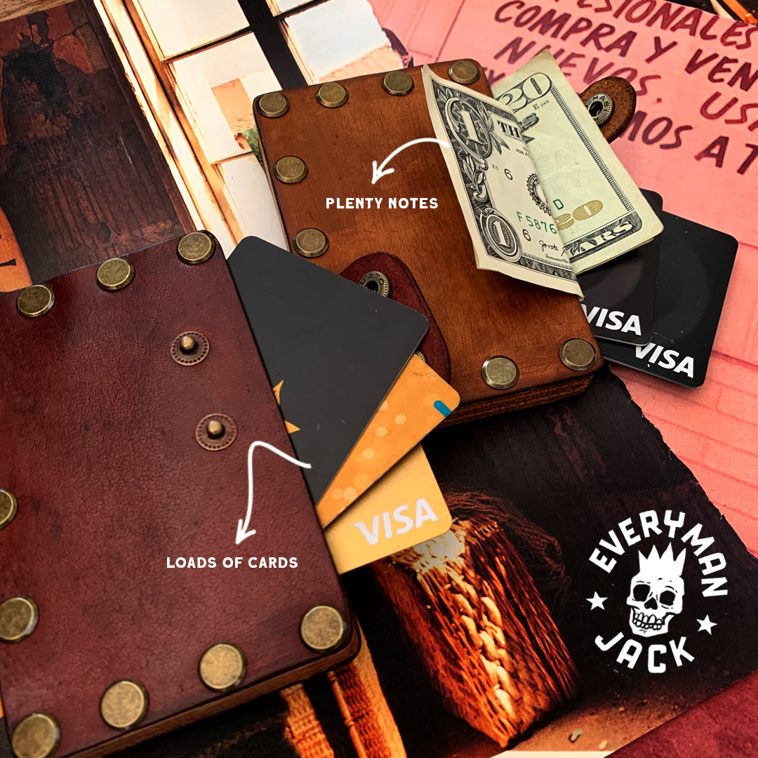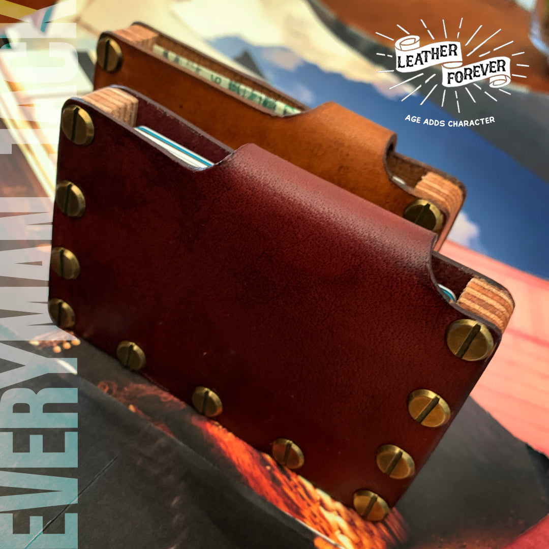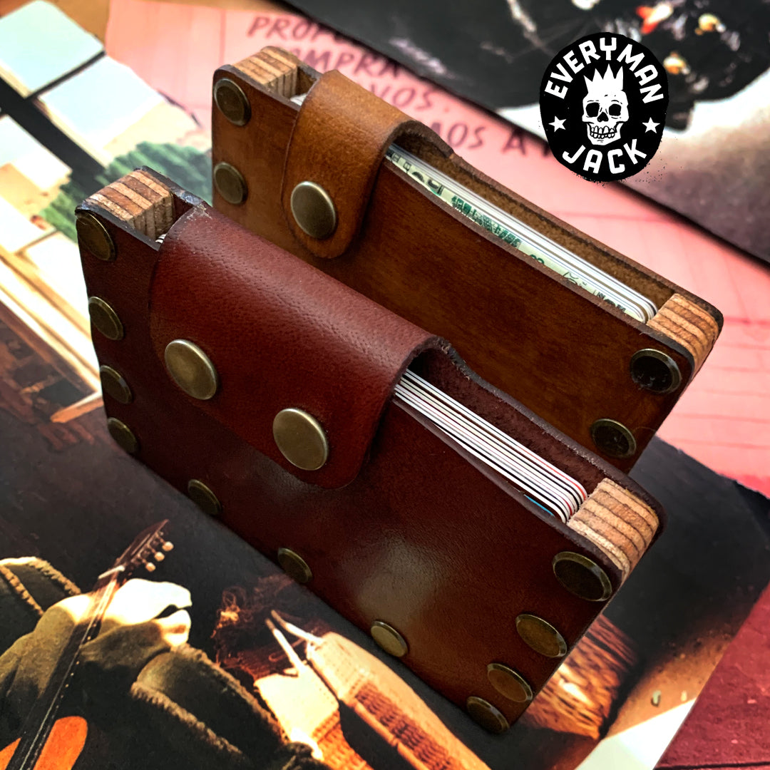 Is wood and leather coming together to create a functional and tough carry with a huge payload carrying 10-12 cards and plenty notes. Hand crafted in wood, hand dyed Water Buffalo leather with metal studs as the final detailing.